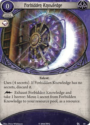 Forbidden Knowledge (or FK, for short) is a level 0 Mystic card that offers you an interesting choice. For 0 resources, you put Forbidden Knowledge into play with 4 secrets on it. Once per round, you may exhaust Forbidden Knowledge and take one horror to take a secret off the card to use as a resource. Four secrets on this card translates to four resources gained and four horror taken over the course of four rounds. Since the card has a very obvious downside – four horror is more horror than even many encounter cards would ever dish out – it may seem like it wouldn’t be worth it to use this. In my opinion, if you are risk averse, you may just want to play Emergency Cache or Uncage the Soul instead if you are a Mystic concerned about how you will pay for things. However, if we take a closer look, we can see that Forbidden Knowledge is still worthy of a slot in certain decks. Let’s take a look at how we can make the most of this card’s power.