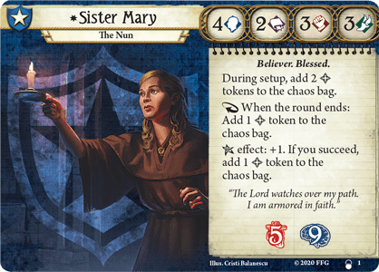- Bless Mary. This one is no surprise, but of course, she has to be on the list. This deck focuses on passive support for the whole team by providing bless tokens that improve skill tests and other supports like Rite of Sanctification and Ward of Radiance. Beyond that, Mary’s card access is flexible enough that she can try to find clues or handle enemies as you need her to.