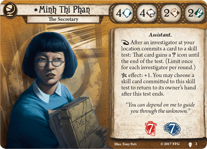 Mariner’s Compass is a fantastic card for Minh, because her naturally high Intellect means she’s not overly dependent on boosting in order to pass the investigation test. However, this is Arkham Horror and we want our skill checks to be as safe as we can reasonably afford to make them. As the main clue getter, we can also expect to be be responsible for picking up clues off of 4+ shroud, and our base 4 Intellect alone won’t be reliable enough. That’s where the rest of the deck comes in.