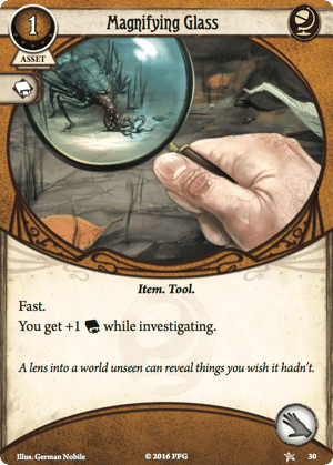 My recommendation is simple – stick a Magnifying Glass in there! It’s Fast speed, and the 1 resource cost can help push you closer to 0 to activate your bonuses at certain resource counts. Dark Horse, Magnifying Glass, and a fully boosted Mariner’s Compass will add up to an Intellect of 9! How much more unstoppable do you want to be, right? Magnifying Glass will give you the added bonus of helping out your investigates when Compass is not available, meaning it’ll be a little bit less punishing should your Compass test fail.