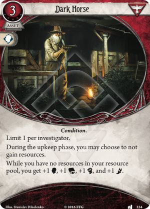Ah, Dark Horse decks. The promise of getting +1 to all your stats is alluring, but the catch of having to sit at zero resources often turns out to be a bigger burden than one might anticipate. It seems as though there is nothing more elusive to find than a Dark Horse deck that doesn’t low-key suck. At last though, I’m ready to throw my proverbial hat into the ring with my special Innsmouth Dark Horse deck – Dark Compass Minh.