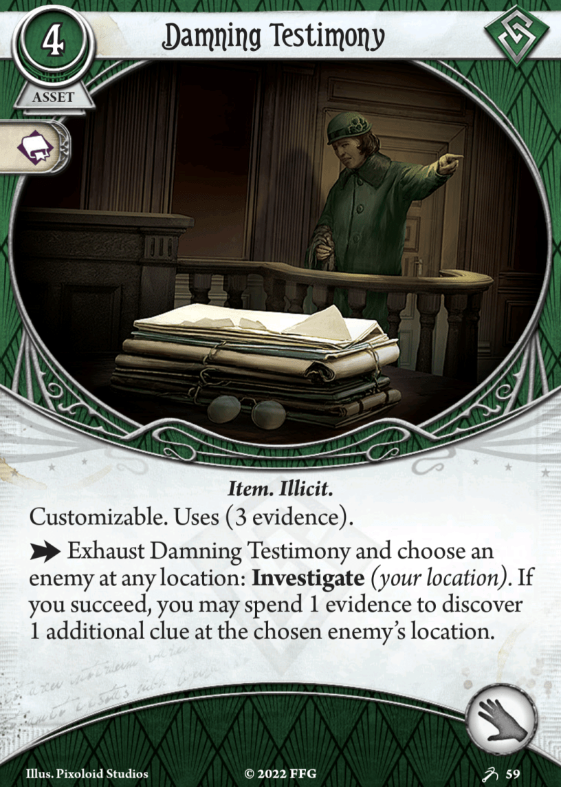 Holy shit, that was fast! Big news for the Arkham community today as long-running community podcast Drawn To The Flame recently revealed a preview card called Damning Testimony, immediately leading to the inception of a new community podcast named after that card.
