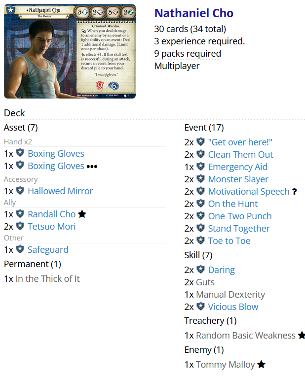Your initial upgrades are Boxing Gloves 3, Hallowed Mirror 3, and Stand Together 3. From there, you can start building up your damage potential by improving your damage events. You might also be interested in picking up Brother Xavier or Girish Kadakia as a team soak alternative to Tetsuo Mori. Whatever you choose, Motivational Speech can help you play it. Since your signature asset is also an ally, you may want to invest in a Charisma if you want to go big on team soaking allies. Finally, Stick to the Plan is always great for Nathaniel if you can afford it as he is dependent on having access to his events. However, if you have good card draw, don’t feel like Stick to the Plan is a necessity.