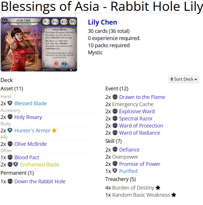 So, this is a Rabbit Hole Lily deck. At first, you might think, “Why would you do that? Lily doesn’t have good upgrade options for Rabbit Hole!” You might also think, “The XP discounts don’t contribute to getting Disciplines faster, so what’s the point of doing this anyway?” A-ha, well, this investigator may just surprise you with how effective Rabbit Hole can be for her.