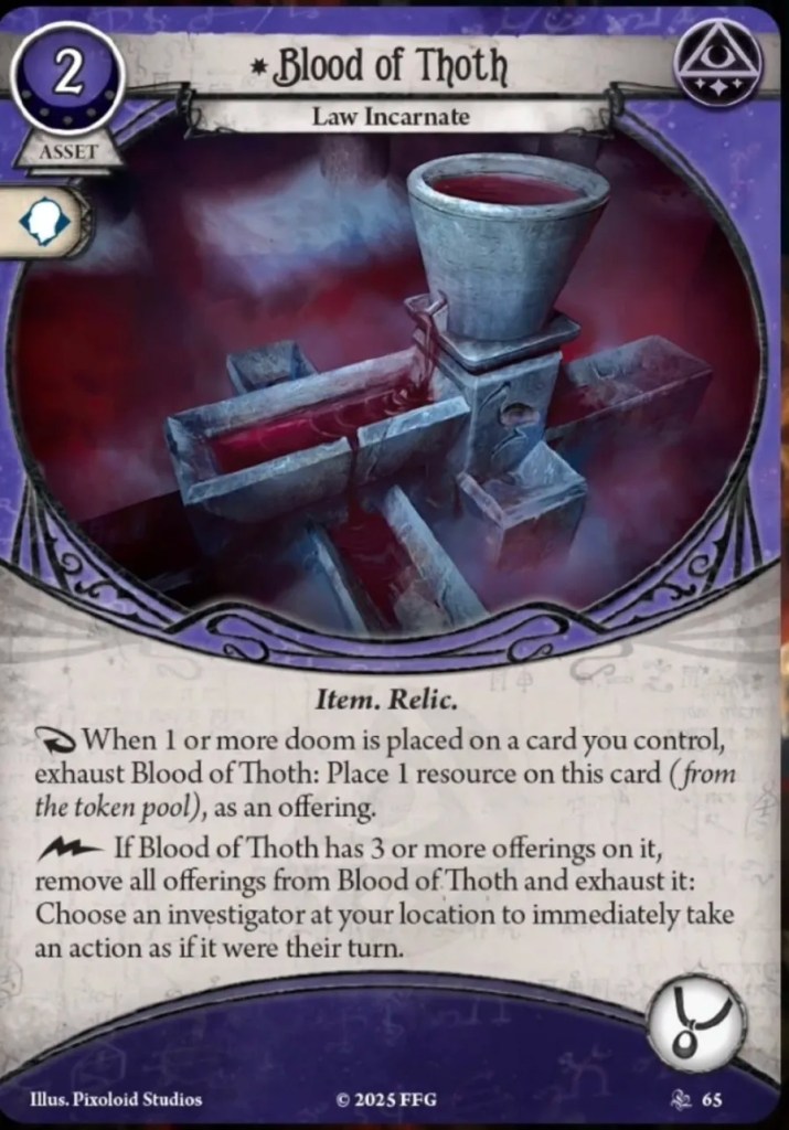 For those who don’t know about this card yet, Blood of Thoth is certainly one of the new player cards that will come in the next expansion! With this card, a doom-centric investigator like Amina Zidane is able to generate one extra action for her team in about 4 rounds of exhausting this over and over, which is enough actions to make up for the one you spent playing Blood of Thoth. Incredible! Can you imagine if you exhausted this 8 times in one game? You could get a second extra action which could go towards playing an Emergency Cache to more than make up the resources spent playing this sensational Relic card. Wow! I’m sure Amina players will be keeping the Taboo list on speed dial once they get their hands on this upcoming box with how exciting and thrilling Blood of Thoth promises to be.