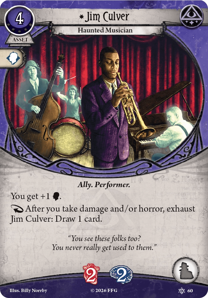 “This Jim Culver card has everything you want,” said card evaluator Gina Simpson. “It’s got a willpower bonus, card draw, and a helpful amount of health and sanity. Honestly, it’s so cool to see FFG adding characters from the lore in this way. I’m excited to play this ally card with a Mystic investigator who is good.”